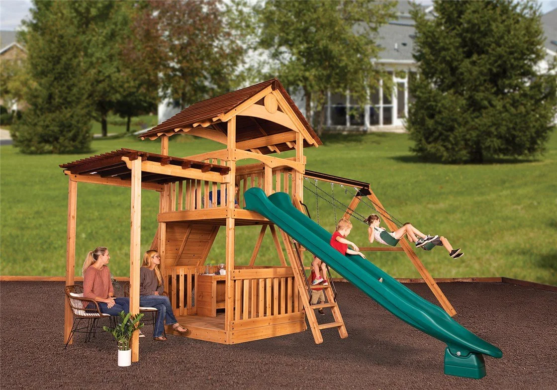 The Olympian Treehouse XL 2 features the brand new pergola for wooden swing sets! The fort structure has a 6' high deck and a ground level play area with 60 sq. ft. of play space. This playset also includes a wood roof, 2- gable kits, 3 position 9' swing beam, 2 - belt swings, trapeze bar, 12' rocket slide, pergola, and the kitchenette. Treehouse Series playsets include our exclusive limited lifetime warranty on all wood, metal, and hardware components.